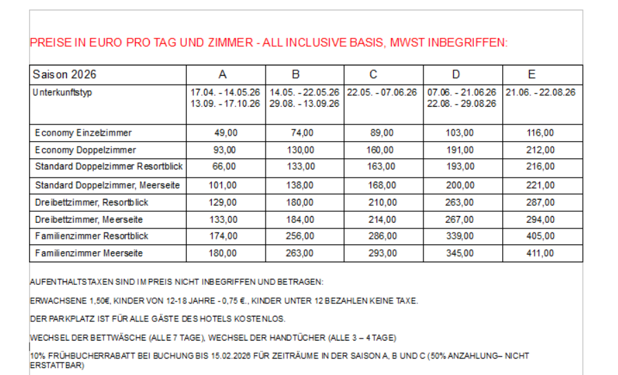 15% Rabatt bei Buchung bis zum 31.01.2025 und 25% Anzahlung und Restüberweisung bis 21 Tage vor der Anreise 10% Rabatt bei Buchung bis zum 31.03.2025 und 25% Anzahlung und Restüberweisung bis 21 Tage vor der Anreise