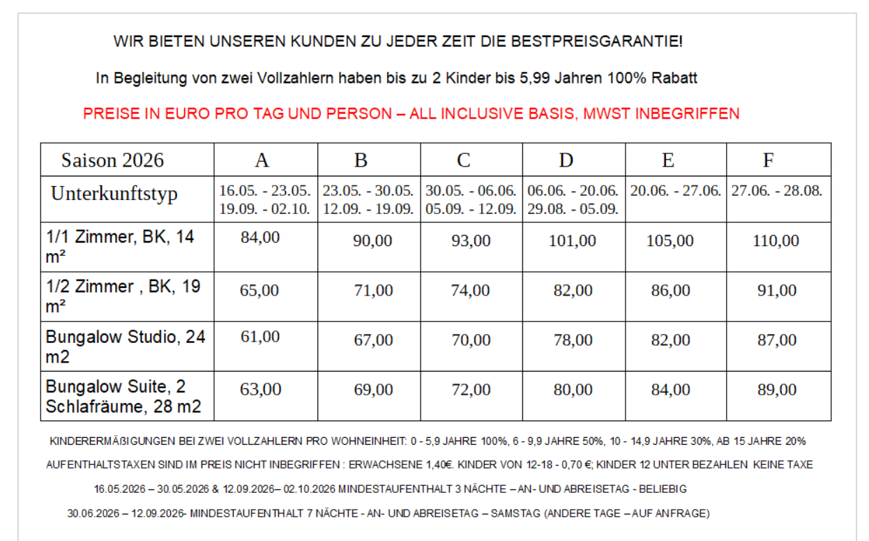 Bis zu 2 Kinder bis 5,99 Jahren haben 100% Rabatt.